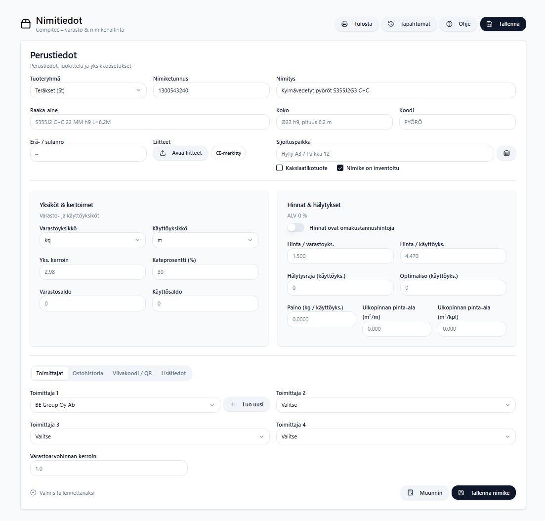 Barcode-driven materials, stock locations, and certificates connected to each item.
